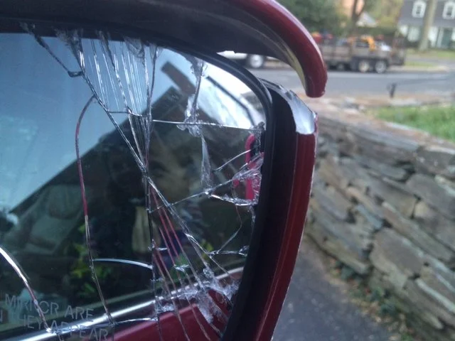 A broken mirror is a relatively small thing. Still, it stings. And not just because it may have happened one other time when THE OTHER family driver pulled too far to the ride side thing as opposed to RIGHT DOWN THE MIDDLE WHICH MAKES SO MUCH MORE SENSE. (Not that I get agitated about such things, we writers like to use all caps for emphasis.)